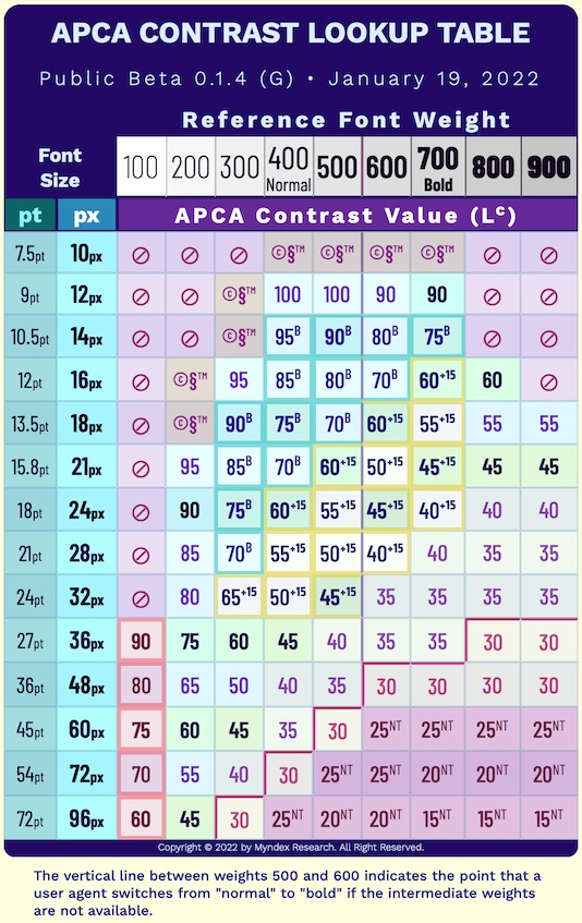 - The contrast value based on WCAG 3.0 (Web Content Accessibility Guidelines) and the new colour contrast method called APCA (Accessible Perceptual Contrast Algorithm).